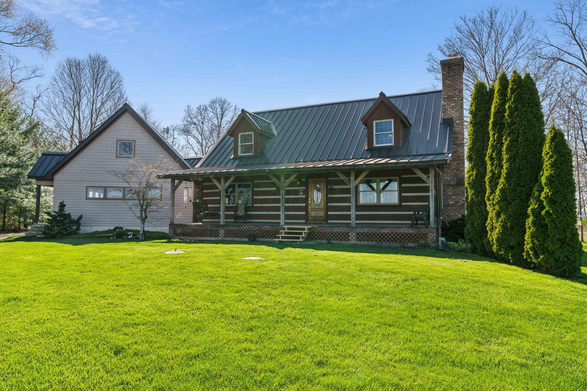 Experience rustic elegance on over 13 acres with this unique log cabin, a true nature lover's dream. The cabin features a 1st floor primary bedroom with en-suite bath and walk-in closet, ensuring comfort. A cozy living area with a wood-burning fireplace sets the tone for relaxing evenings. For guests or family, the property offers a separate guest suite with 2 baths and a full kitchen. Full basement provides ample storage or potential for added living space. Outdoor enthusiasts will love the land and 2 outbuildings; one heated with electric and a kitchen, perfect for entertaining or a workshop, the other for storage or a garage. Water is sourced from a reliable artesian well. Located just a short drive from town, yet offering unparalleled privacy, this property is a one-of-a-kind retreat